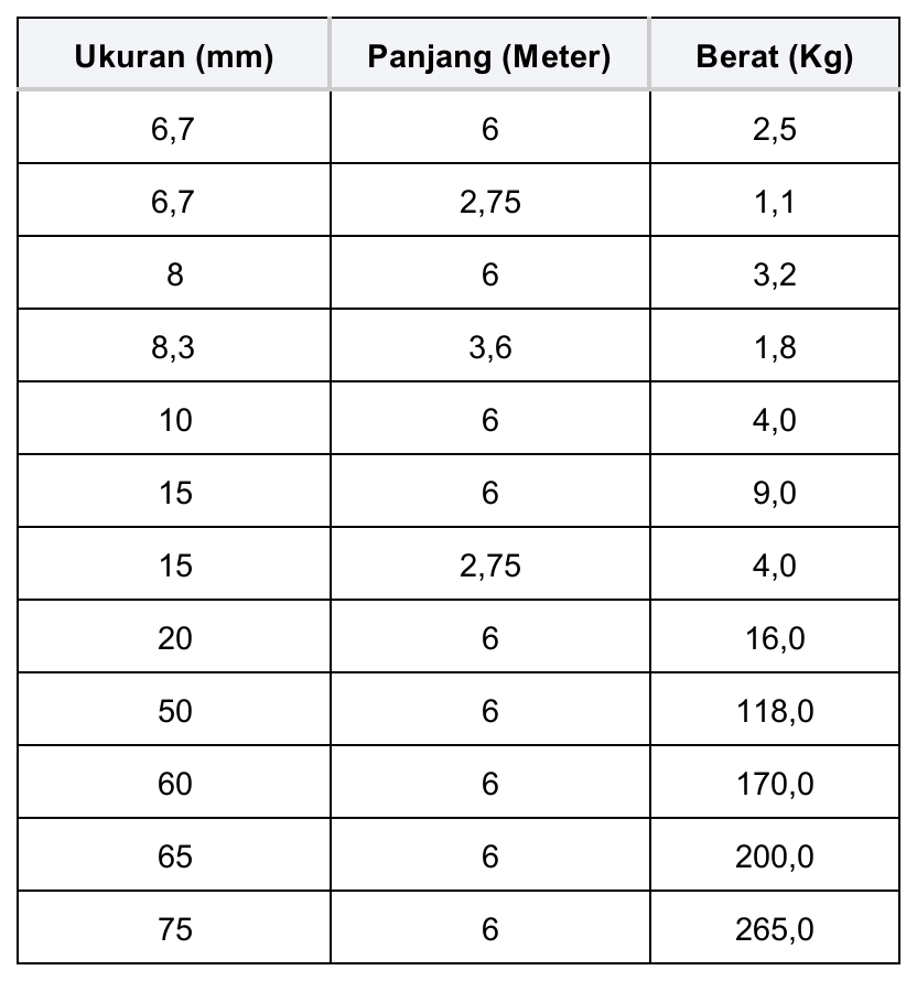 - Panjang Standar: 6 meter atau sesuai kebutuhan